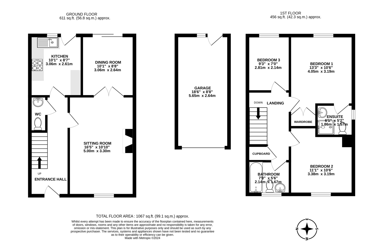 Upstairs are two double and one single bedroom. The master bedroom having an en-suite shower room and built in cupboard. There is also a family bathroom.