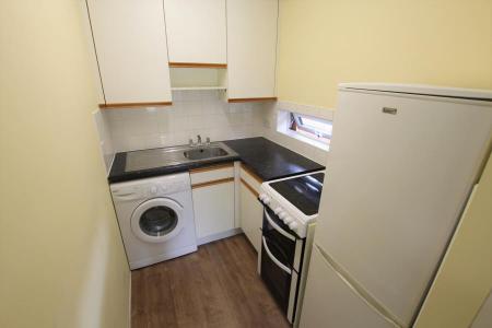 A well-presented ground floor studio flat in Goldsworth Park, featuring a spacious studio room with built-in bed, a bathroom with shower, and a separate kitchen equipped with a washing machine, fridge/freezer, and cooker. Includes allocated parking.