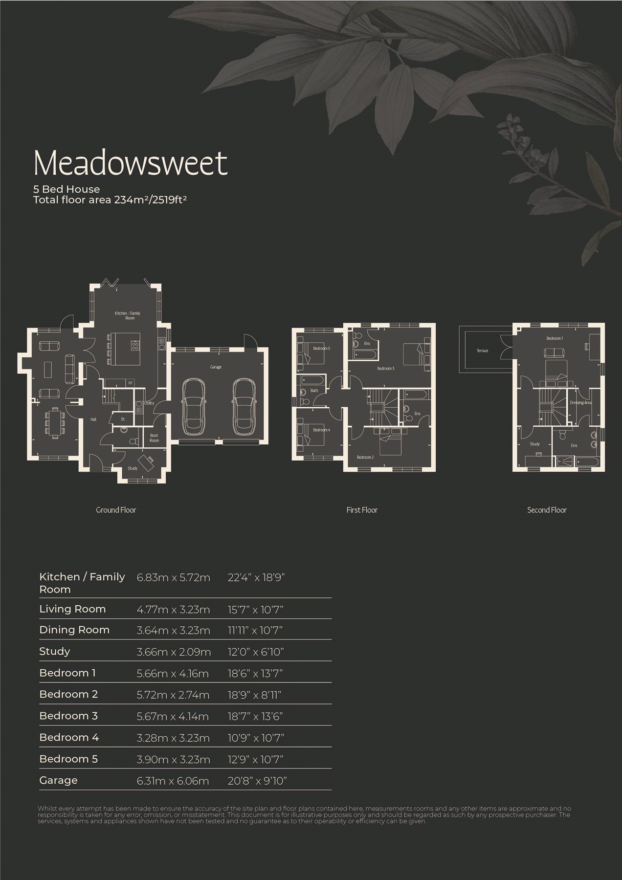 A wonderful spacious 5 bedroom detached home with modern flexible living and generous entertaining spaces. This home really has it all with its large living, formal dining and family kitchen with bi-fold doors to the enclosed garden. Two studies enable working from home an easy option. The Meadowsweet has an integral double garage. The first floor offers a bright and airy second and third bedroom with en suite facilities, bedroom four, five and family bathroom. The impressive master bedroom suite can be found on the second floor, complimented by a dressing area and ensuite, this stunning part of the home impresses further with a private roof terrace, creating a personal sanctuary with delightful rear aspect views over the garden and recreational grounds. *Any CGIs or conceptual imagery are indicative only & subject to change*