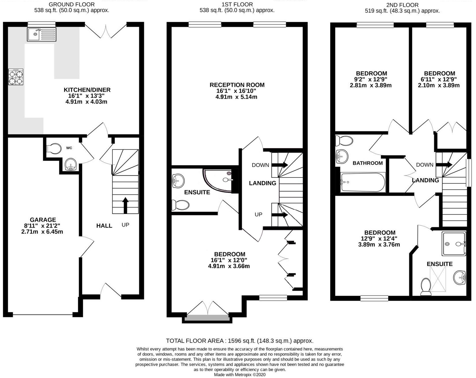The ground floor features an entrance hall, WC, and a modern fitted kitchen open to the dining area. On the first floor, there is a generous living room, a guest bedroom with fitted wardrobes, and an en-suite shower room. The top floor offers a master bedroom with fitted wardrobes and an en-suite bathroom, two further bedrooms, and a family bathroom.