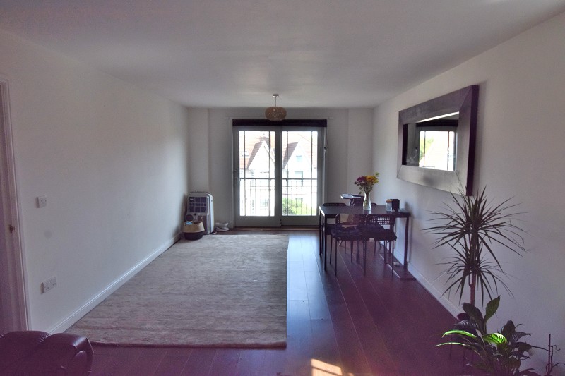 LIVING ROOM - Laminate wood effect flooring, electric radiator, double glazed sliding doors to Juliet balcony to front aspect , double glazed window to side aspect.
