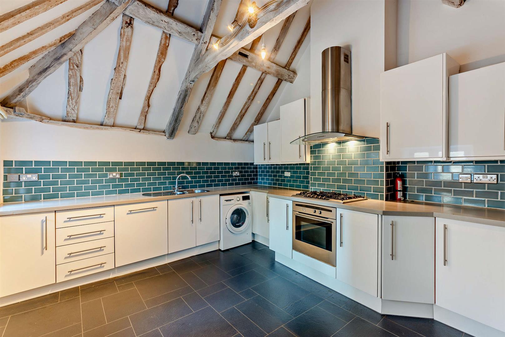 On entering the apartment you are immediately led through to the modern kitchen fully equipped and beautifully contrasted with exposed oak beams. On this level you will find the dining room featuring an original period fireplace adding a touch of elegance for entertaining. The grand living room boasts an incredible high ceiling, solid wood flooring delivering a touch of warmth and sophistication.
