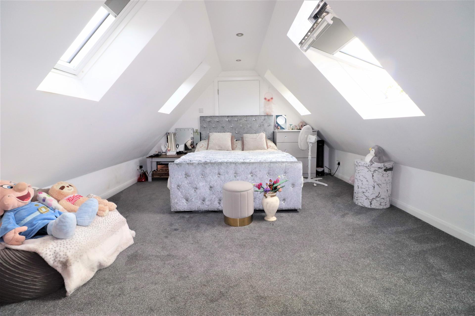 Situated on the second floor with two Veluxe style windows to both the front and rear. Walk in eaves storage space. Wall mounted heater.