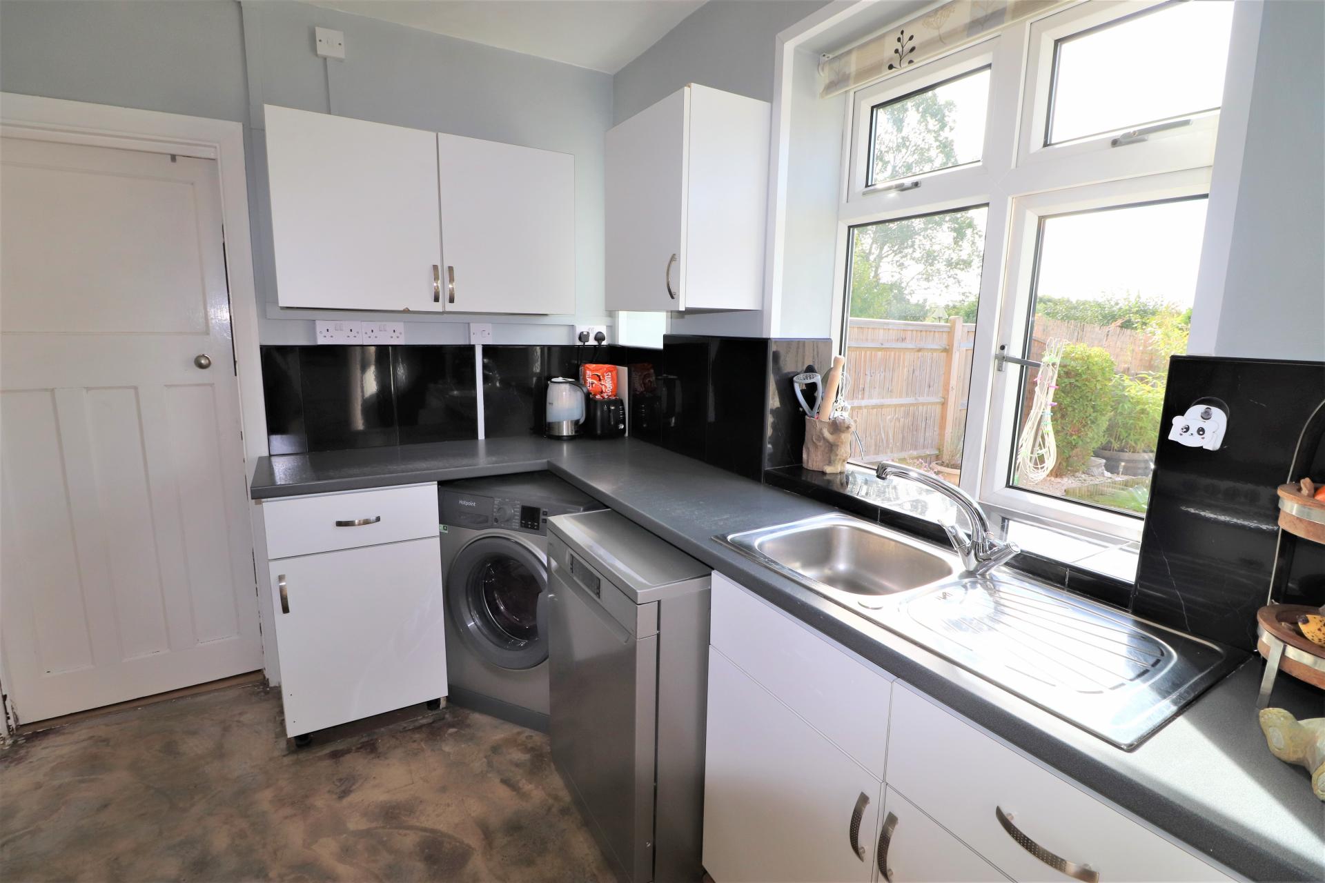 Part tiled with two double glazed windows to the rear overlooking the garden. Roll edge work tops with inset stainless steel single bowl, single drainer sink unit with mixer tap. Space and plumbing for both a washing machine and dishwasher. Space for a cooker. Range of base units and drawers with matching wall mounted cupboards.