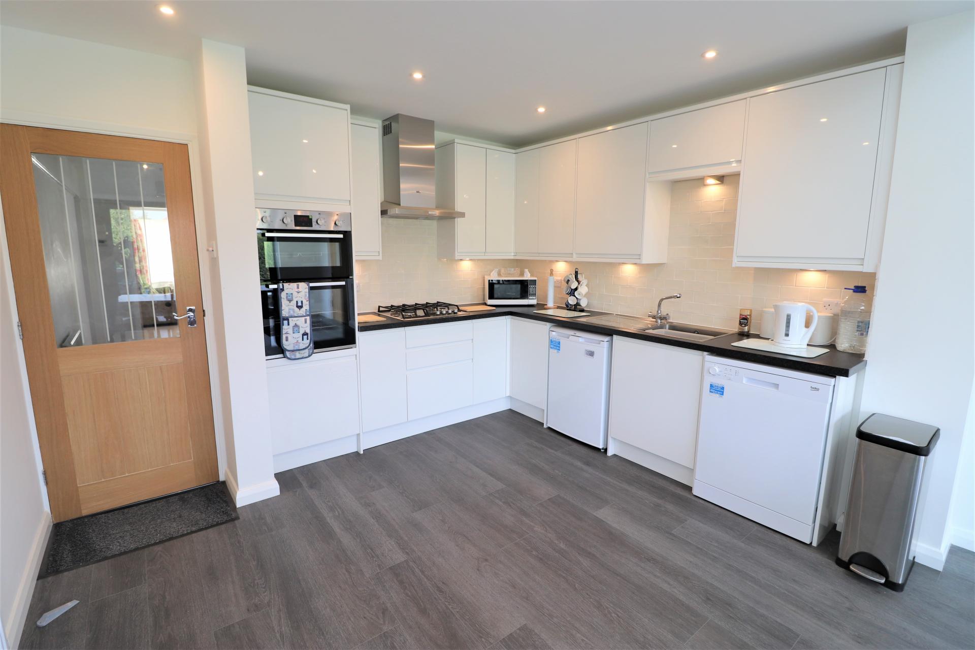 Worktops with inset stainless steel, single bowl, single drainer sink unit with mixer tap. Range of base units and drawers with matching wall mounted cupboards. Double oven. Four ring gas hob with stainless steel extractor hood over. Fridge. Dishwasher. Double panel radiator.