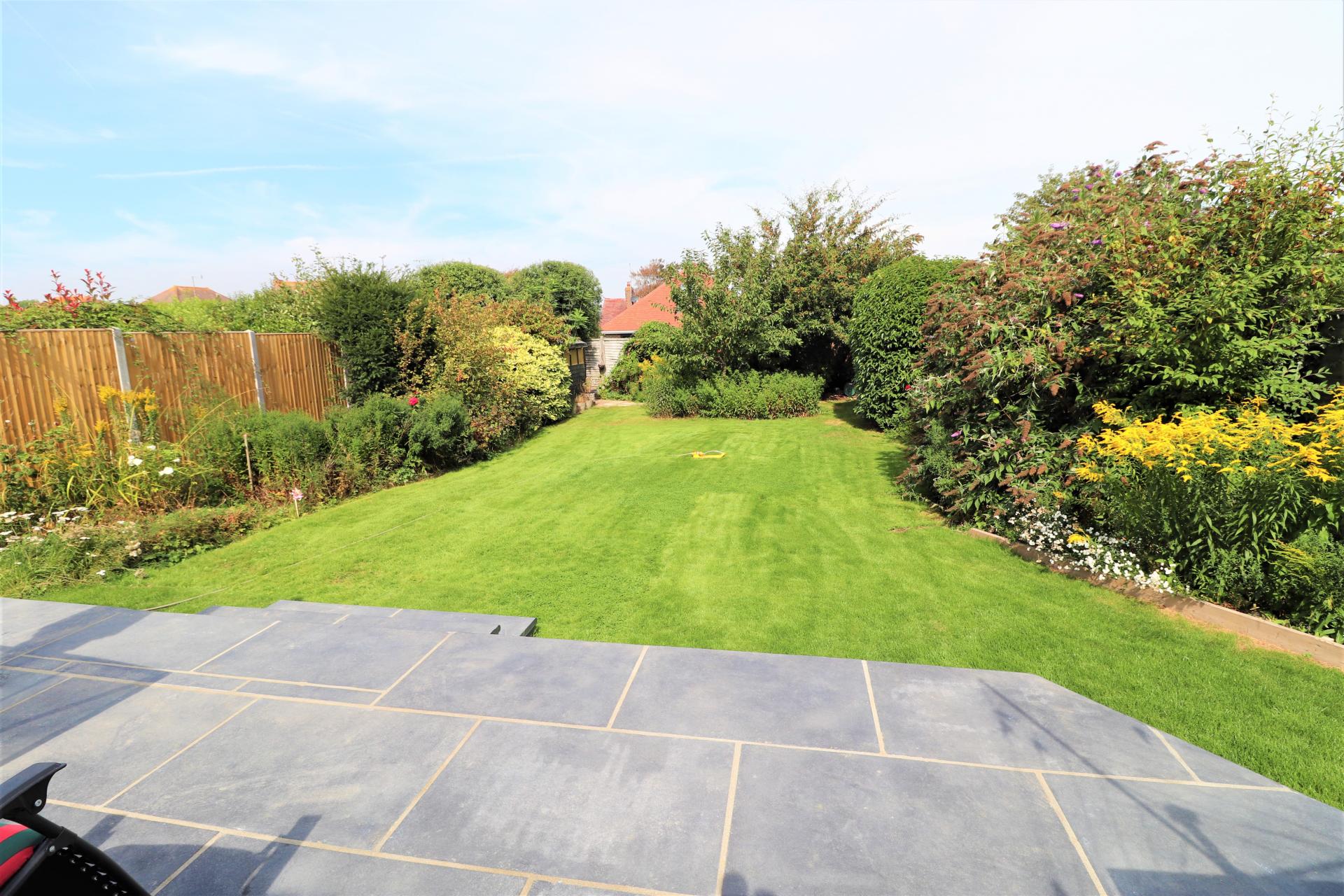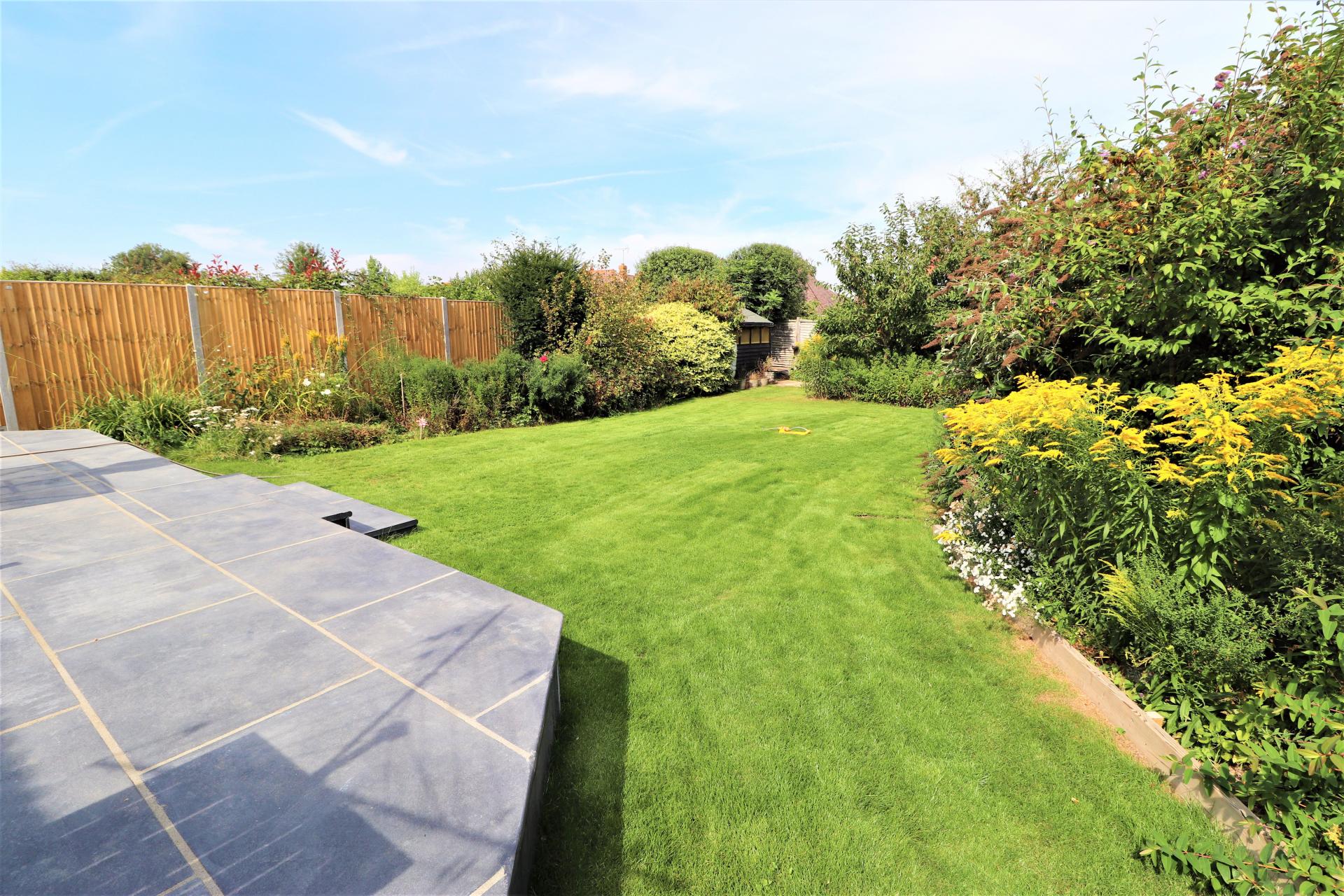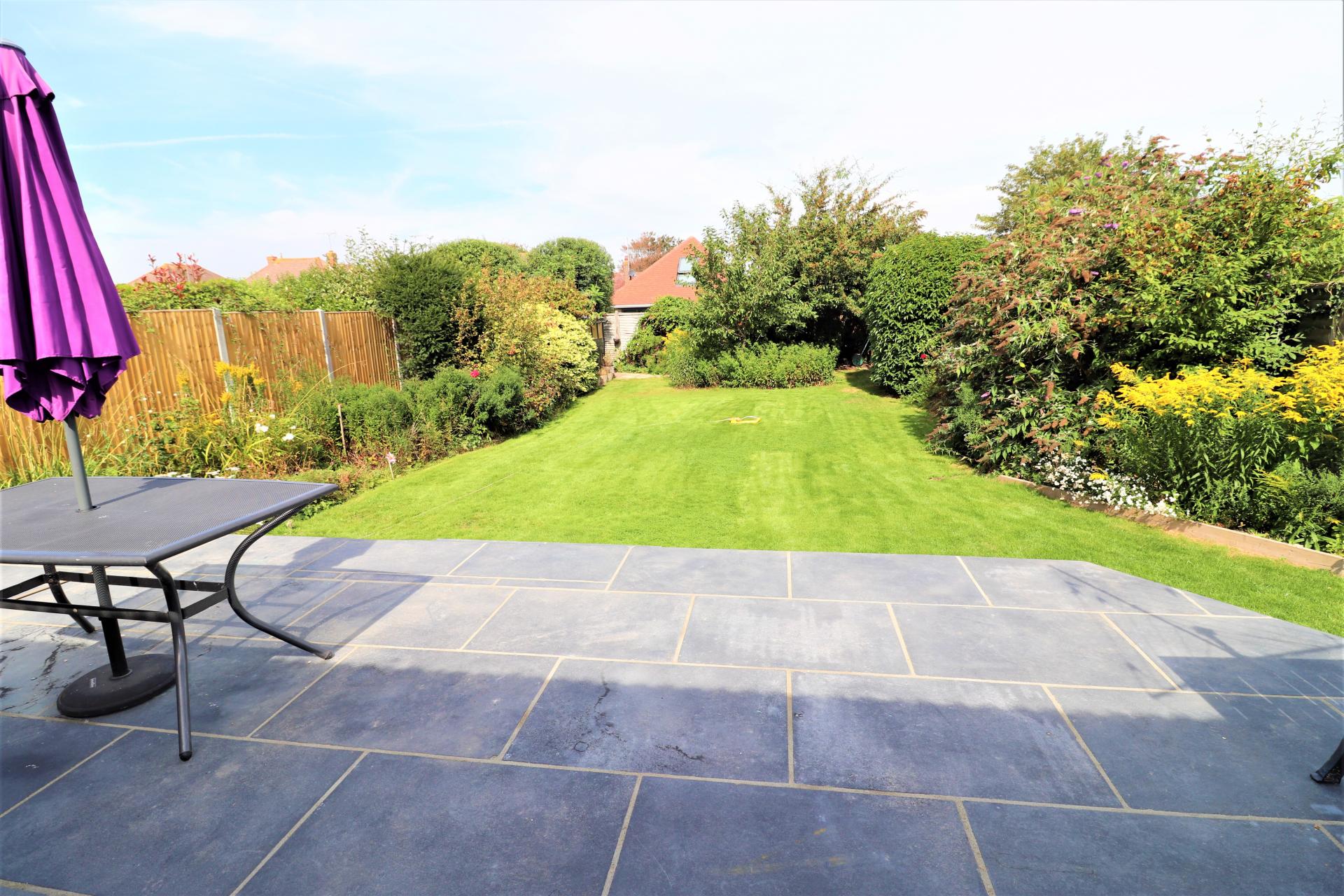 Beautifully kept mainly laid to lawn with a range of shrubs and trees. Patio area. side access.