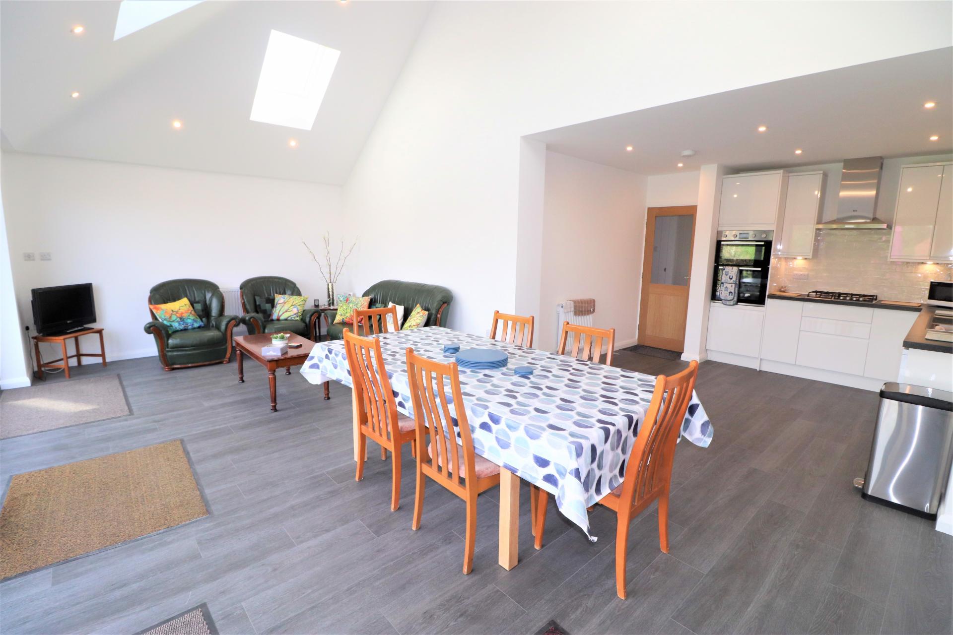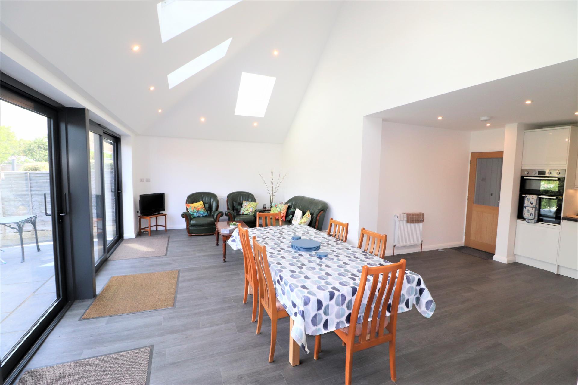 Quadruple double glazed doors to the rear garden and terrace. Vaulted ceiling with 4 skylight windows and inset ceiling spot lights. Two double panel radiators.