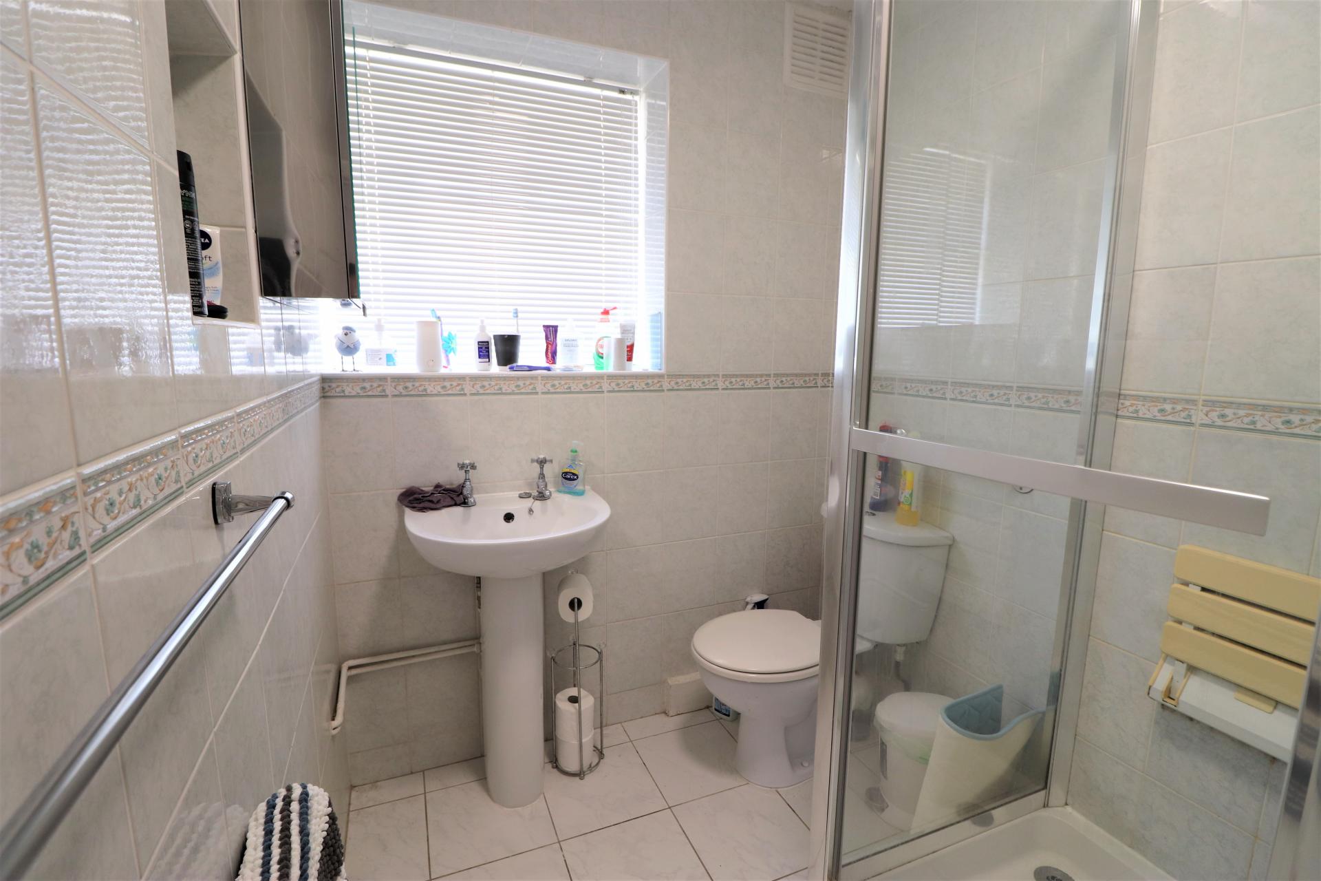 Tiled room with double glazed window to the side. Enclosed glazed cubicle with wall mounted shower unit. Low level WC. Wash hand basin with vanity cupboard below. Double panel radiator.