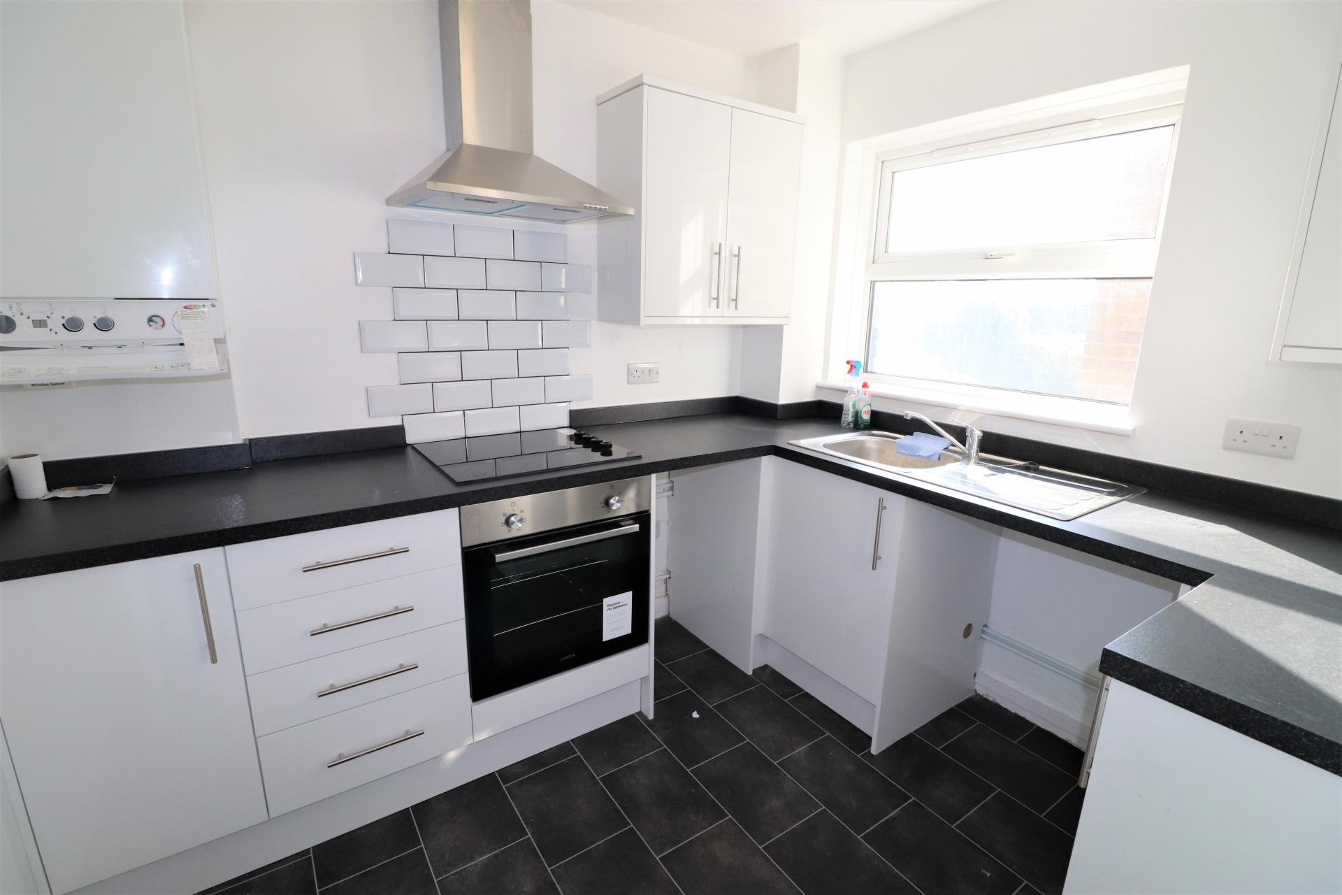 A range of white high gloss wall and base units, roll edged worktops incorporating a single bowl stainless steel sink with drainer and mixer tap, appliance space and plumbing for washing machine, electric oven and hob with extractor fan above, double glazed window with Southerly aspect, wall mounted boiler, tiled effect vinyl flooring.