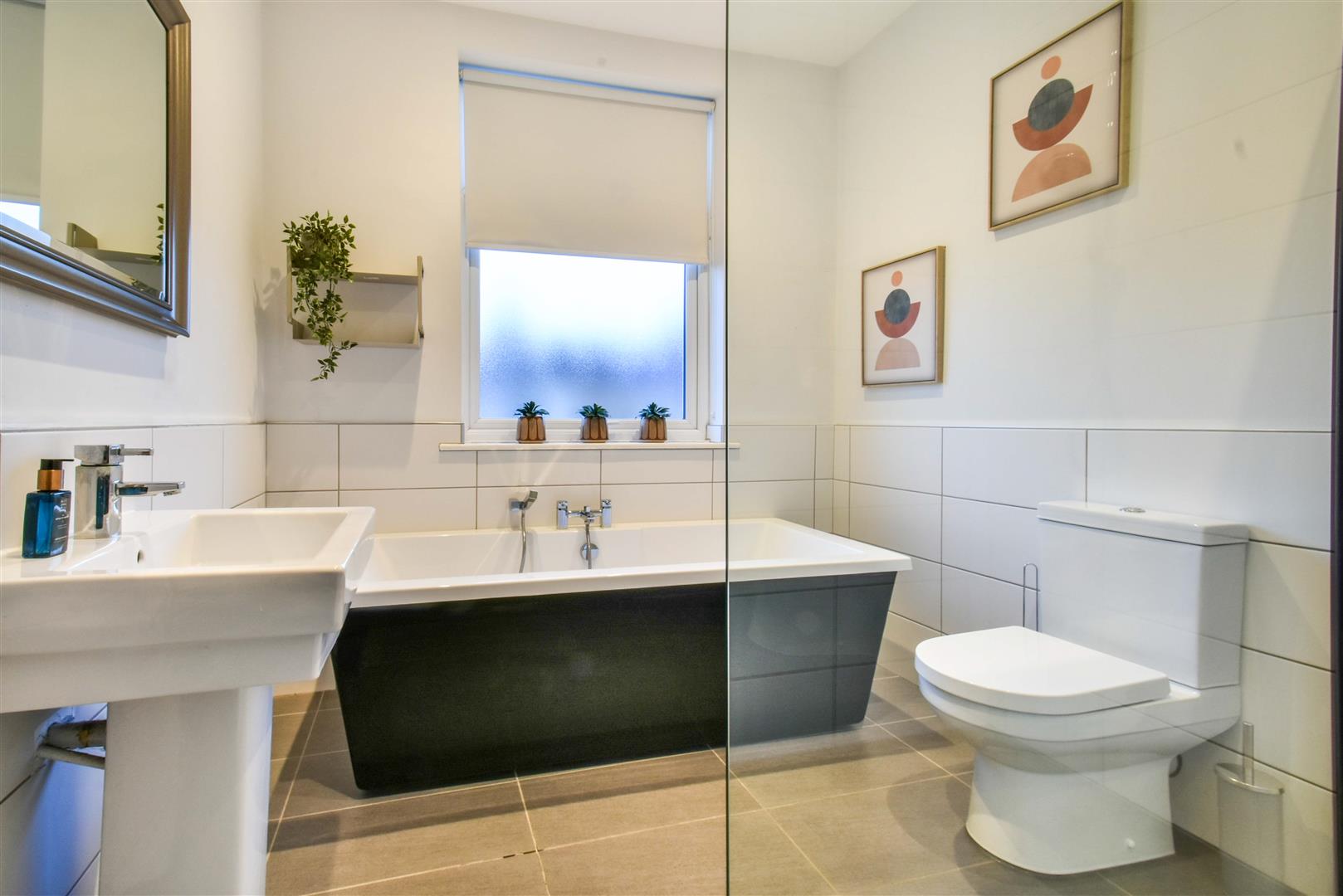 Bathroom - Feature free standing bath, separate large walk-in digital shower cubicle, pedestal wash hand basin, low level WC, uPVC double glazed window to side, extractor fan, chrome towel rail/radiator. Tiled floor.